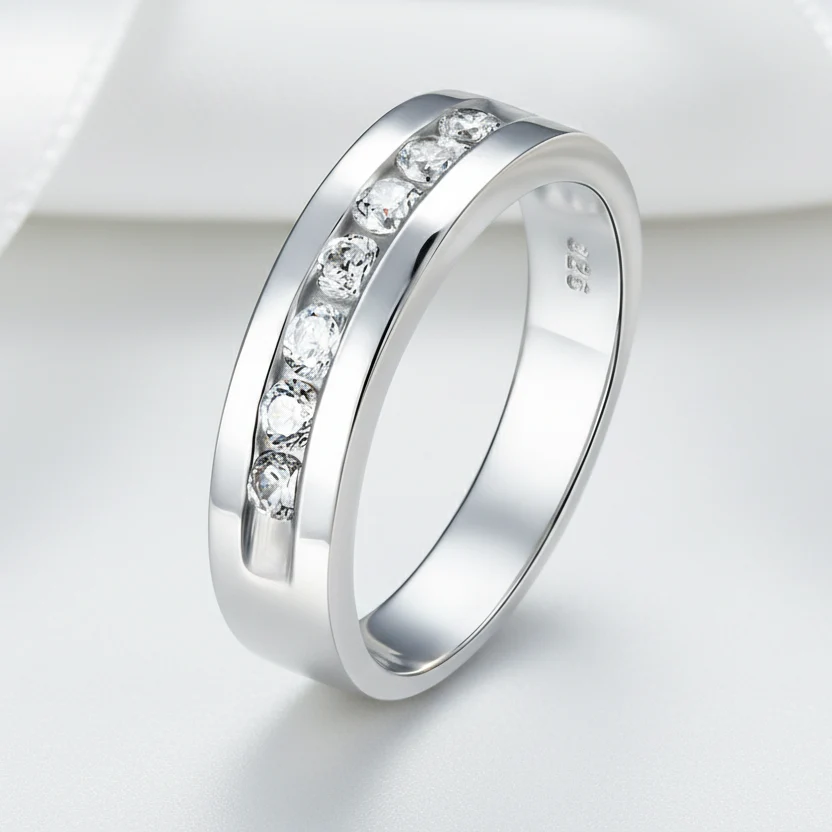Elevate your everyday style with this striking men's wedding band, where timeless elegance meets modern craftsmanship. Featuring channel-set diamond alternatives in lustrous 925 Sterling Silver, this piece delivers genuine sparkle without the premium price tag. Built to withstand a lifetime of wear, it's the perfect symbol of commitment for the man who values quality and sophistication. Whether marking a milestone or celebrating your bond, this ring shines as brilliantly as your love story.