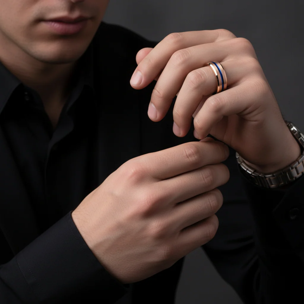 This 8mm men's tungsten carbide wedding band in rose gold, highlighted by a vibrant blue line, is meticulously handcrafted to deliver stunning brilliance and sparkle like a diamond. It’s designed for you, your loved ones, and the one who cherishes you.