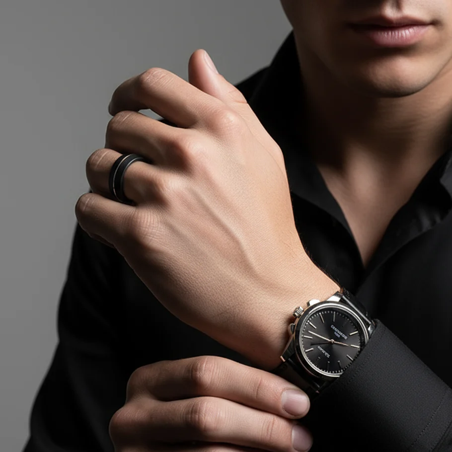 A sophisticated choice for the discerning groom, this men's wedding band pairs jet-black tungsten carbide with an elegant rose gold accent line. The robust 8mm width provides substantial comfort and presence on the finger, while tungsten's renowned hardness ensures it withstands daily wear without compromise. Perfect for someone seeking a wedding ring that's as enduring and dependable as the commitment it represents.