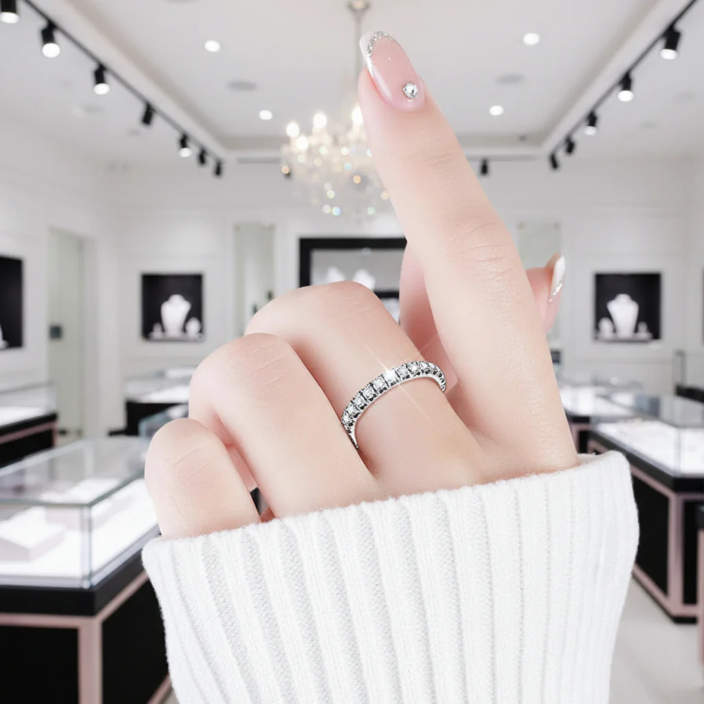 Elevate your style with this exquisite Single Round Cut Diamond Alternative Eternity Ring. Crafted from a luxurious blend of silver and platinum, plated with gleaming white gold, and adorned with dazzling created diamonds in a classic round shape. Make a statement of timeless elegance and sophistication.