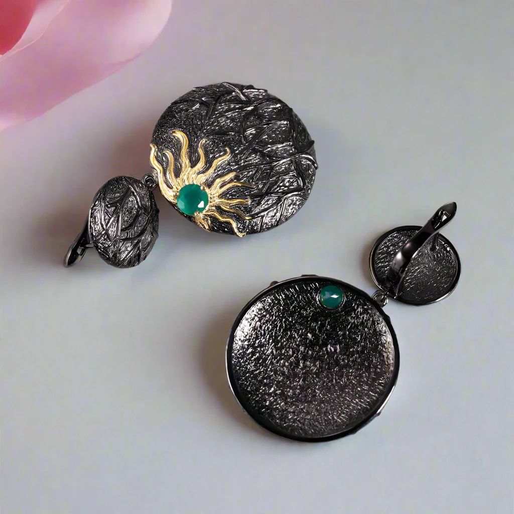 Elevate your elegance with the Sun Chaser Drop Earrings, featuring natural green agate gemstones measuring 5x5mm. Crafted from 925 sterling silver and enhanced with a gold plating, these refined earrings blend timeless metalwork with the serene beauty of green agate.