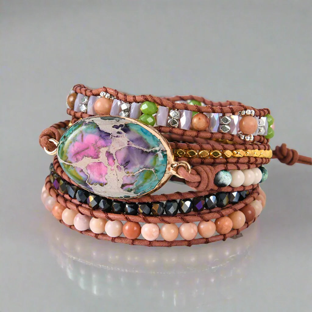 This exquisite Bohemian bracelet boasts a distinctive blend of natural stone, supple leather, and intricately crafted alloy. Handmade with precision and care, it exudes a sense of luxury and exclusivity.